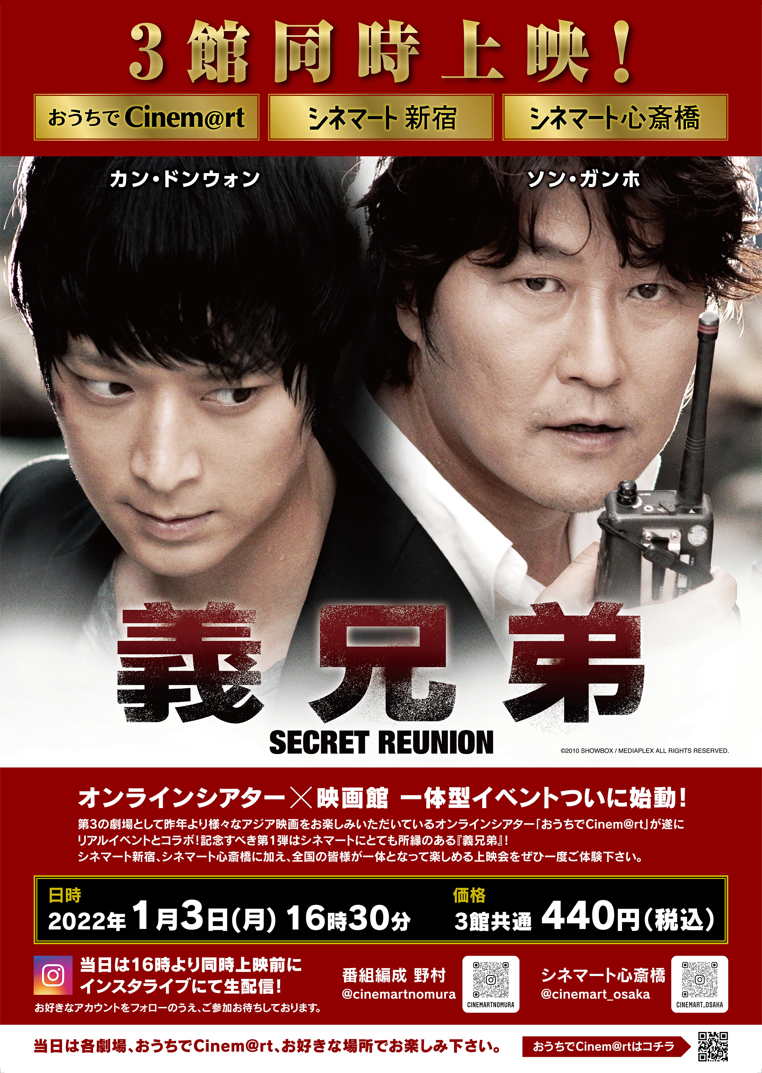 第3の劇場として昨年より様々なアジア映画を配信中のオンラインシアター「おうちでCinem@rt」が遂にリアルイベントとコラボ!記念すべき第1弾はシネマートにとても所縁のある、ソン・ガンホ&カン・ドンウォン共演の『義兄弟 SECRET REUNION』を同時上映。