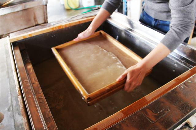 水槽には、水と楮の繊維、そしてトロロアオイ※が入っており、それを漉桁ですくい前後左右に揺らしながら、薄く均等な紙を作っていくのですが...
