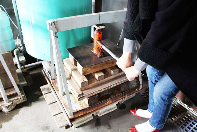 現代はこのようにプレス機を使いますが、昔は重石を置いて絞っていたようです。