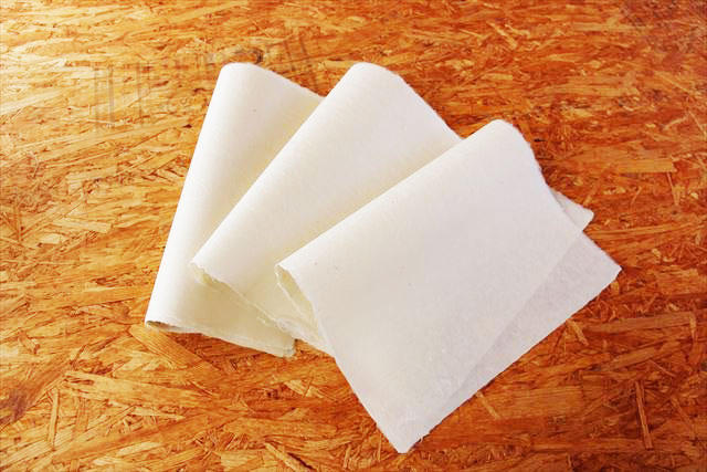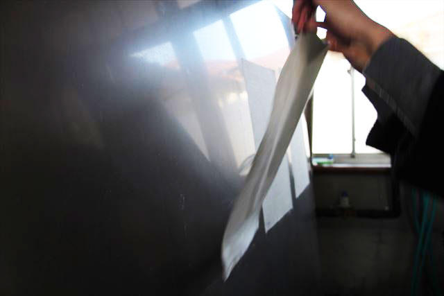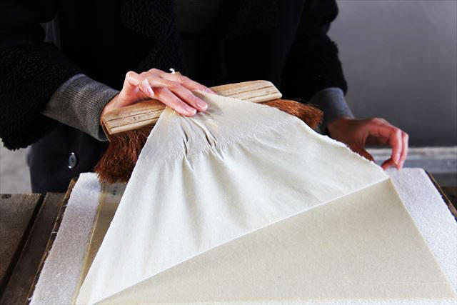 ぺったんこになったミルクレープ状の紙を、ハケを使って丁寧に1枚ずつめくり、乾燥板へペタリ。乾燥板の上で、ハケできれいに伸ばしていきます。