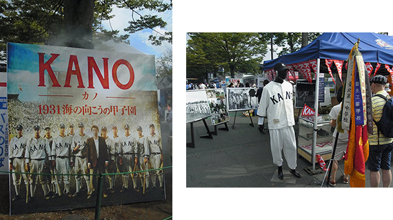 西武球場前駅で電車を降り改札を抜けると、球場前広場にはKANO関連のパネル写真や、映画で使われたユニフォーム、小道具が展示されていました。
