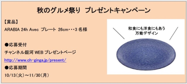 CSエンターテインメントチャンネル「チャンネル銀河 歴史ドラマ・サスペンス・日本のうた」(チャンネル銀河株式会社、 東京都千代田区、 代表取締役社長:関本好則)では、 11月8日(日)よりはじめる、 秋のグルメ祭り「孤独のグルメ」と「ワカコ酒」一挙放送を記念して、 フィンランドARABIA社製プレートのプレゼントキャンペーンを実施いたします。