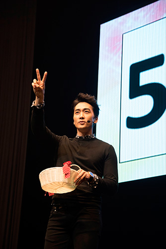スンホンさんが一人で舞台に立ち、次のマジックの説明を丁寧に始めます。