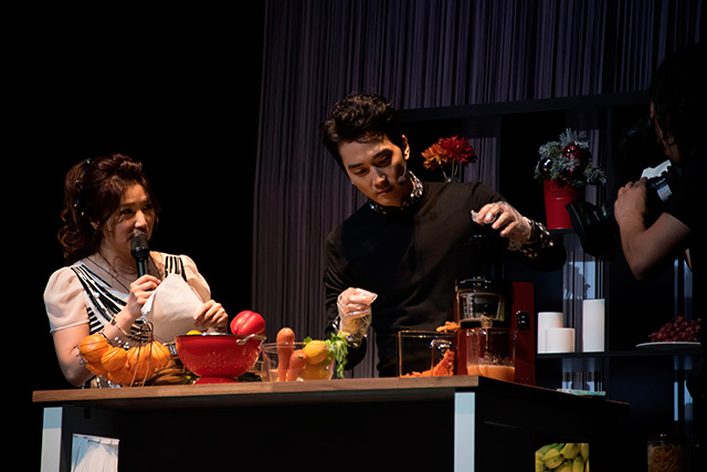 「 僕が美味しいジュースを作って差し上げますからね!」と舞台上手にあるキッチンへ!(このためのキッチンでした!)