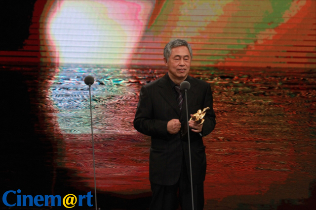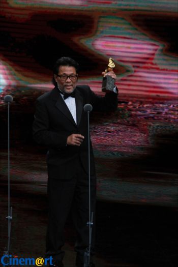 すると、鈕承澤(ニウ・チェンザー)がトロフィーを持って登場! 深々と一礼すると監督が右手を挙げて応えます。『風櫃の少年』の出演など、侯孝賢とともに台湾ニューシネマを支えた映画人たちのサプライズに、またまた会場が大きく沸きました。
