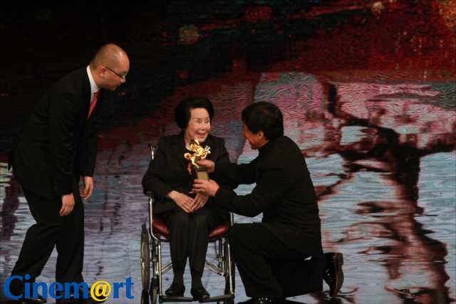 李麗華は古裝片『楊貴妃』『武則天』などで知られ、金馬奨では2度主演女優賞を獲得。ハリウッド映画にも進出し、120以上の映画に出演した往年の名女優です。その彼女と尤敏(ユウ・ミン)が主演し、ショウ・ブラザーズの李翰祥(リー・ハンシャン)がメガホンを取った『梁山伯與祝英台』で映画デビューを果たした子役時代のジャッキー。その時の歌を一節歌ってくれる一幕も。少ない出番ながらその演技を評価してくれた李麗華が『秦香蓮』でジャッキーを息子役にと指名してくれ、それ以来ジャッキーにとって彼女は「乾媽(義理の母)」なのだそうです。ジャッキーが呼び込むと、李麗華が車椅子で登場。ゲストや観衆がスタンディングオベーションで迎え、ジャッキーが跪いてトロフィーを授与しました。