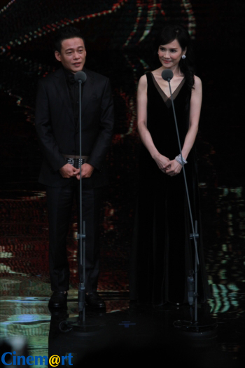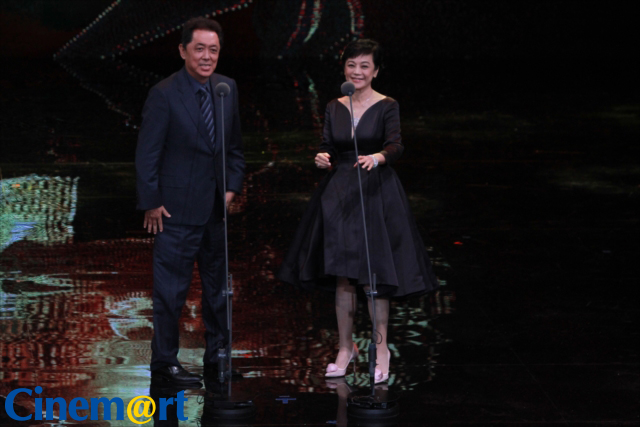 ついに最後の賞、作品賞です。プレゼンターはチェン・クオフー審査員長と、胡金銓(キン・フー)監督作『侠女』で知られるトップ女優で、後に『さらば、わが愛・覇王別姫』を製作した徐楓(シュー・フォン)。彼女がコールしたタイトルは、「黒衣の刺客」。