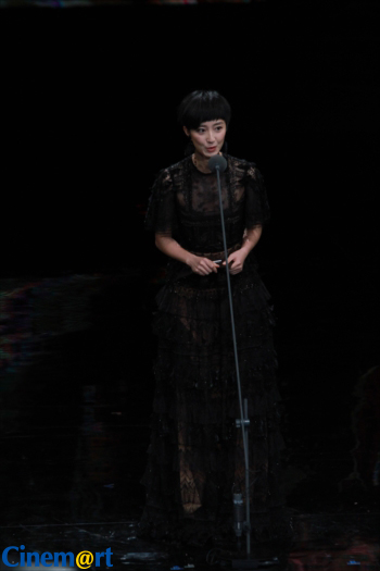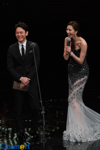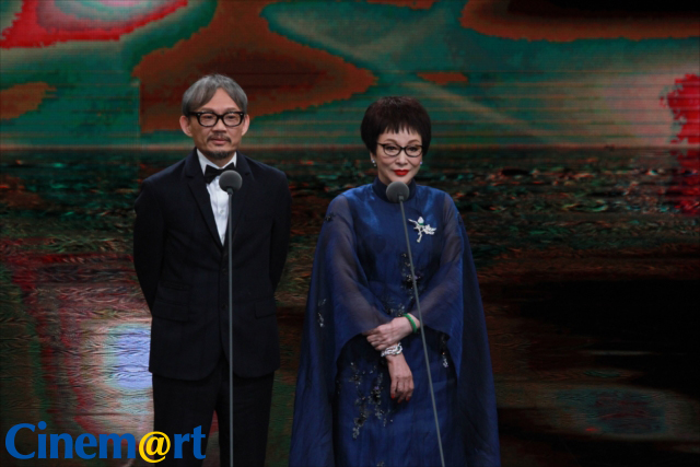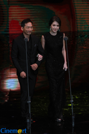 丁可が『踏血尋梅』のノミネート曲〈漆黑的海上〉を歌唱したあと、プレゼンターの張震(チャン・チェン)と河智苑(ハ・ジウォン)が登場! ハ・ジウォンが中国語、チャン・チェンが韓国語で挨拶したあとは英語でトーク。『20歳よ、もう一度』の陳柏霖(チェン・ボーリン)やツァイ・ミンリャンなど国際的に活躍する台湾映画人に触れ、その後『黒衣の刺客』を再現したようなスローなアクション(?)を披露すると、侯孝賢監督が親指を立ててグーサインを出し、会場からは拍手喝采となりました。それにしてもハ・ジウォンがとても素敵! 中国語も英語も上手くて、国際的で知的でユーモアのある女優の姿は、韓国代表としても十分な貫禄がありました。