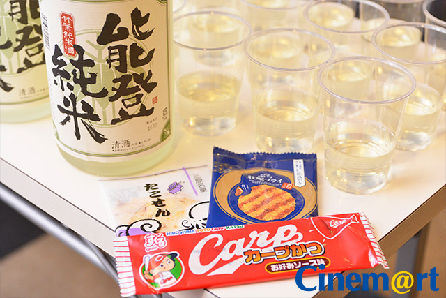 おつまみはワカコの故郷が広島ということで、「ぷち牡蠣フライ」「たこせん」「カープかつ」の広島お菓子3点セット!