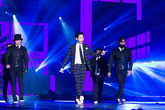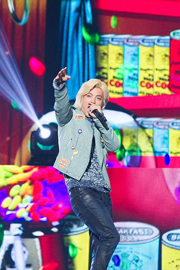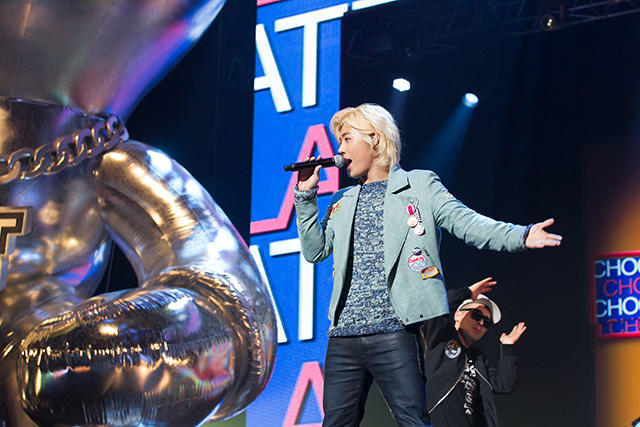 TWICEが退場すると、「楽しんでる? 昨年に続いて、オレが来たんだってば」と声が。誰だ? そう、コンベンションでも大いに笑いを振りまき独壇場だったKangNamが、アーティストとして登場! ダンサーを引き連れ、〈CHOCOLATE〉を歌う彼。声が可愛い。