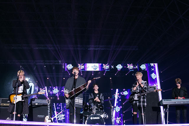 そんなMCを受け登場したのが、これまた日本初パフォーマンスとなる注目のロックバンド、DAY 6! ソンジン(G)、Jae(G)、Young K(B)、ウォンピル(Syn)、ドウン(Dr)の5人組です。すごい歓声の中始まった1曲目は〈Lettig go〉。スケール感のある曲です。