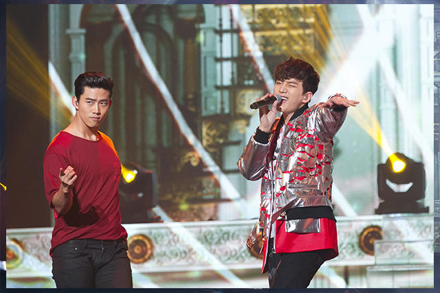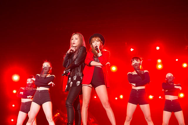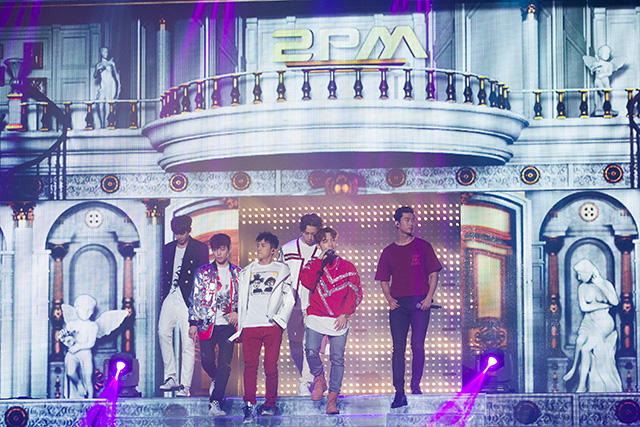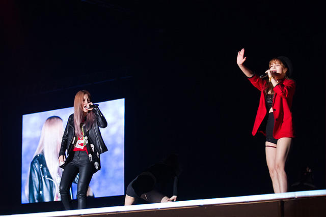 さて、客席の一部がざわつき始めました。なんとMCとして、2PMのテギョンとウヨンが客席通路に登場! テギョンが「しーっ」とジェスチャーするくらいの大歓声。「K-POPスターにはみんなキャッチフレーズがあるよね?」「SHINHWAなら最長寿アイドル」「2PMなら野獣アイドル」なんて話から、話題は女性アーティストの盛り上がりについて。「ガールクラッシュの時代」と言われているそうです。