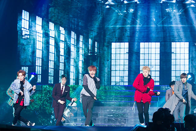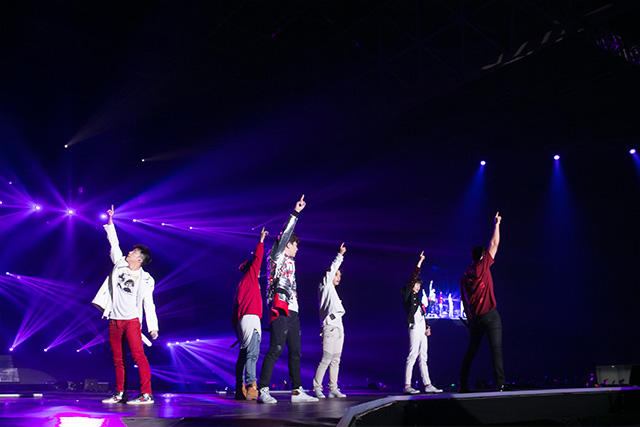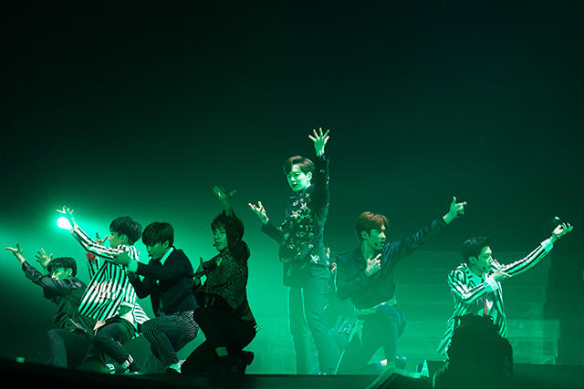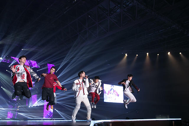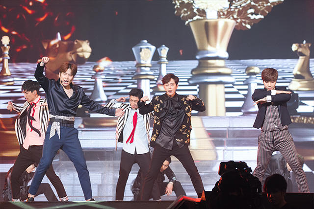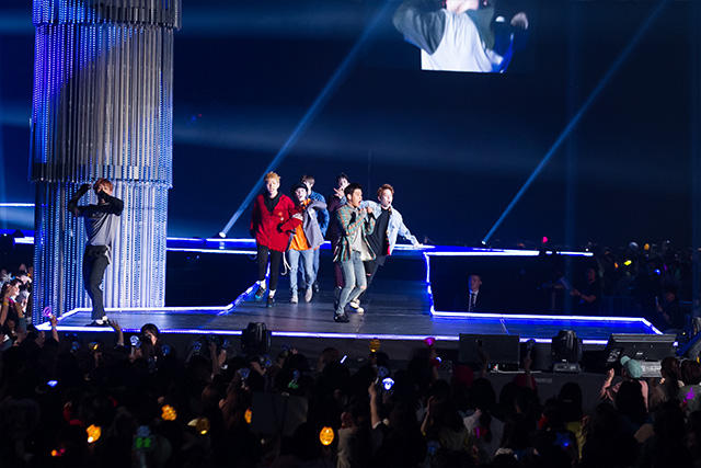 1曲目は約1年前にリリースされた〈BOUNCE〉。最近はすっかり大人っぽくなりましたね。と思いきや、トークが始まって何かバタバタ。どうやら順番が狂ったようです。「あ、自己紹介忘れちゃった」と、慌ててドンヒョン、ヒョンソン、ジョンミン、クァンミン、ヨンミン、ミヌが日本語で自己紹介。可愛い。