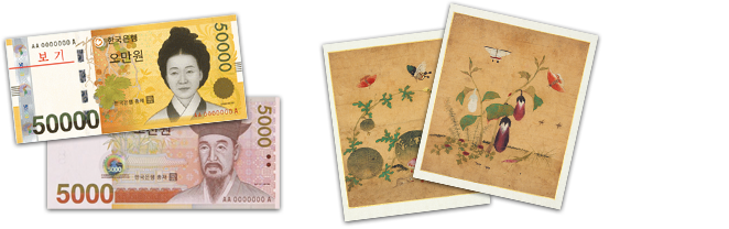 韓国で2009年に登場した5万ウォン札には、朝鮮時代の女流書画家であり、良妻賢母の象徴として名高い師任堂(サイムダン)の肖像が採用された。女性初の快挙であり、同時に代表作「墨葡萄図」「草虫図繍屏」も背景として使われている。