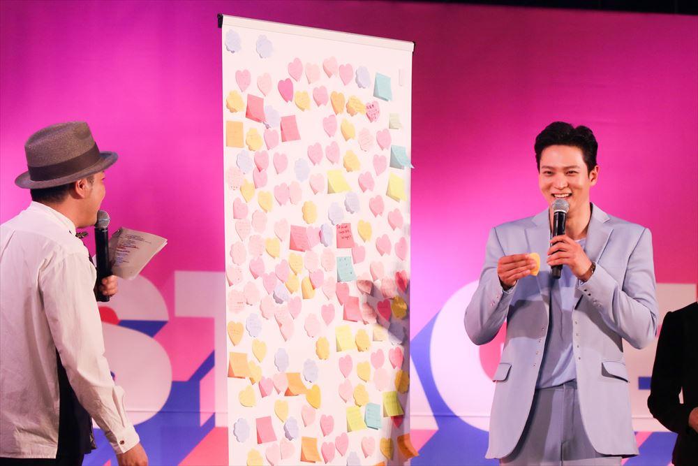 7つ目のコーナー"A"は「アンサー(Answer)」。KCON会場で来場者から寄せられたチュウォンへの質問に答えるというもの。質問が書かれたたくさんの付箋の中からチュウォン自身が選んで答えるのだが、毎回さも日本語が読めるように付箋を選び、それっぽく話してみせるチュウォンに、会場からは爆笑が巻き起こった。