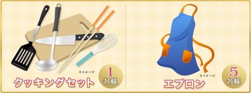プレゼント内容: クッキングセットまたはエプロンを抽選でプレゼント!