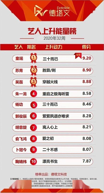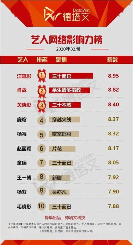 中国で市場分析を展開する德塔文科技による影視観察(datawinfilmtv)データより、2020年第32周目の影響力TOP10にランキングした俳優・アーティストを、ピックアップしてご紹介!(このデータは、リストの期間中の俳優・アーティストの影響力の上昇を反映し、アーティストの潜在的な価値を引き出すことを目的としたものです)。