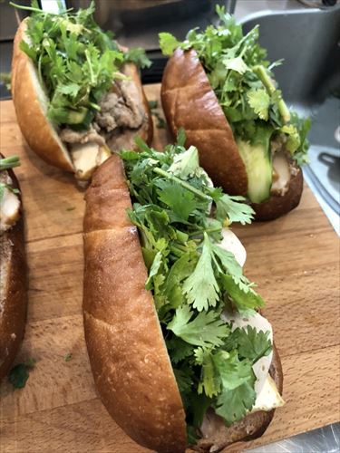 もともとバインミーはパンを意味する言葉でしたが、 パンにレバーペーストを塗り肉や魚、 野菜、 卵などを挟んで食べるようになり、 それがバインミーとして日本に伝わった。バインミーはベトナム国内ではファーストフードとして各地で食べることができ、 バインミーとベトナムコーヒーという組み合わせは非常にポピュラーな食べ方だそう。Cafe Bambooではベトナムコーヒーとバインミーをセットで提供することを決め、ベトナム出身シェフに協力いただきバインミーを開発した。