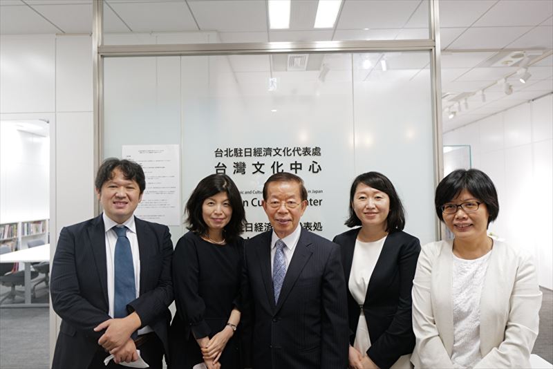 駐日代表謝長廷(中央)とSNET台湾メンバー帝京大学教授山崎直也、 大妻女子大学准教授赤松美和子、 一橋大学教授洪郁如、 台湾文化センター主任王淑芳