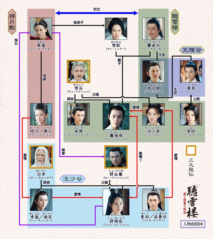 江湖の頂点に君臨し、 世を正す組織・聴雪楼の楼主。 生まれつき抱える厥陰(けついん)の病により短命だと宣告されたが、 月魂の力で症状を抑えながら生き長らえている。 雪谷(せつこく)大師の弟子で、 両親を奪った拝月教とは因縁が。