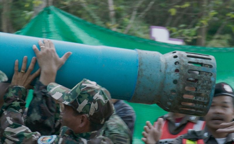 6月23日に閉じ込められ、7月2日にようやく13名の生存を確認。しかし彼らの救出まではさらに時間を要し、高度な技術を有するダイバーですら命を失いかねない洞窟ダイビングが強いられるなか、どうやってダイビングの経験すらない少年たちを救出するのか…。洞窟内は複数の箇所で完全に水没。穴の高さが1メートルにも満たない場所すらある過酷な状況での前代未聞の救出作戦は、困難を極めた。事故発生から18日目の7月10日になってようやく、全員無事に救助された。しかし、タイ人ダイバーが酸素不足で亡くなるなど、壮絶な救出劇となった。