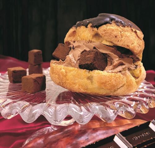 薄く焼き上げたサクサクのチョコレートパイで人気の〈ドゥーブルショコラミルフィーユ〉から、 濃厚なチョコレートクリームと生チョコをトッピングした新発売のシュークリームが数量限定で登場。