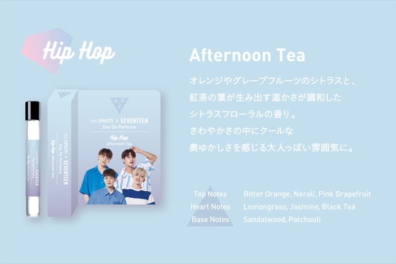 ボーカルチームの甘い歌声と可愛らしさを表現。 甘いピーチとアンズに少しピリッとしたジンジャーの香りが、 繊細なジャスミンと調和した甘く刺激的なフルーティフローラルの香り。