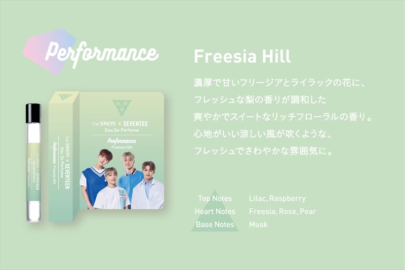 パフォーマンスチームのフレッシュな爽やかさを表現。 濃厚で甘いフリージアとライラックの花に、 フレッシュな梨の香りが調和した爽やかでスイートなリッチフローラルの香り。