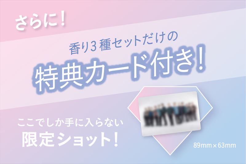 ポーチに入れて持ち歩きやすいロールオンタイプのオードパルファムで、「Vocal」「Hip Hop」「Performance」各チームのイメージを表現した3つの香りがラインナップされている。 もれなく1枚メンバーカード付き(ランダム13種)。 ※数量限定生産のためなくなり次第終了。