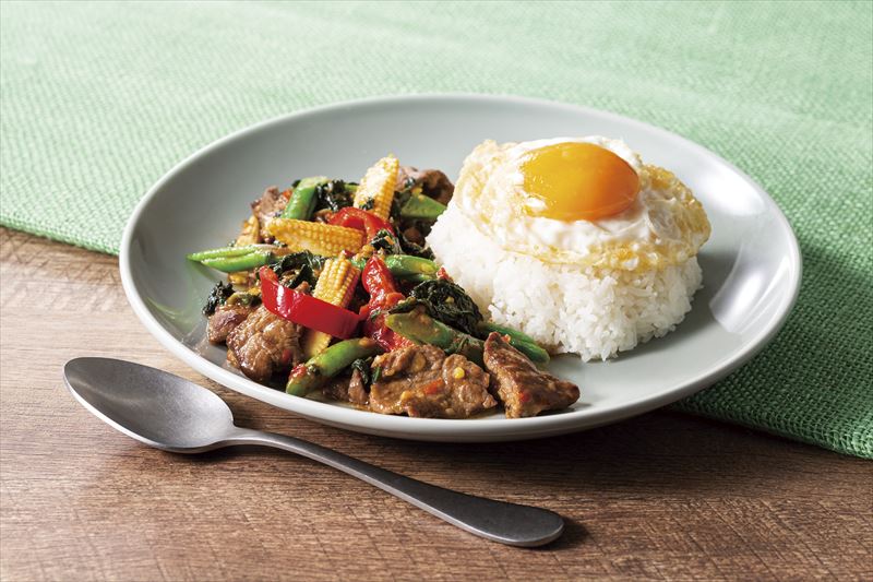 ジューシーな牛肉の旨味とナンプラーのコクが絶妙で、爽快な香りのタイハーブ“ガパオ”も際立つスパイシーでパンチの効いたガパオです。