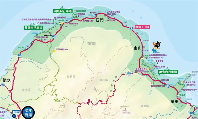 淺水湾(チェンシュイワン)、 白沙湾(バイシャーワン)、 中角湾および野柳地質公園では公共自転車(YouBike)をレンタルすることができ、 好きなサイクリングコースを選んで景観を楽しんだり、 北海岸をぐるっと周遊することもできる。