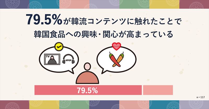 「K-POPや韓国ドラマなどの韓流コンテンツに触れる機会が増えた」と回答した人の約79.5%の人が「韓流コンテンツへの接触機会の増加に伴い、 韓国食品への興味・関心が高まった」と回答。
