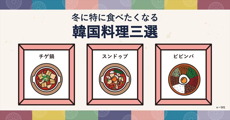 寒くなるこれからの季節にぴったりの韓国料理。 調査回答者が選ぶ「冬に特に食べたい韓国料理」にはチゲ鍋、 スンドゥブ、 ビビンバがTOP3に選ばれた。