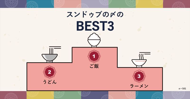 「冬に特に食べたい韓国料理TOP3」にも選ばれたスンドゥブの〆料理としての人気ランキングも調査。 1位ご飯、 2位うどん、 3位ラーメンが選ばれた。