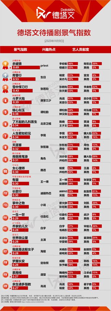 第1位は「殺破狼(原題)」。作品主演芸能人らの景気指数への貢献指数はリー・ホンイー(李宏毅)36% 、タン・ジェンツー(檀健次)32%。第二位は「青簪行(原題)。作品主演芸能人らの景気指数への貢献指数はヤン・ズー(楊紫)51% 、クリス・ウー(呉亦凡)40%。第三位「雪中悍刀行(原題)」。作品主演芸能人らの景気指数への貢献指数はチャン・ルオユン(張若昀)44%、チャン・ティエンアイ(張天愛)33%という結果に。