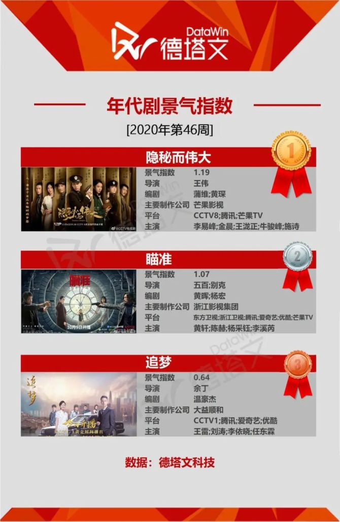 第46週は、マーケットチャンピオンをめぐる争いが激しく、「隐秘而偉大(原題)」「瞄准(原題)」「燕雲台(原題)」はそれぞれ話題が多く、現在この3つのドラマすべてがブームになっています。これは年末にかけて、テレビドラマ市場が熱くなり始めたことを意味しているとdatawinは分析しています。今回は人気カテゴリー内でのトップ3作品をご紹介していきます。