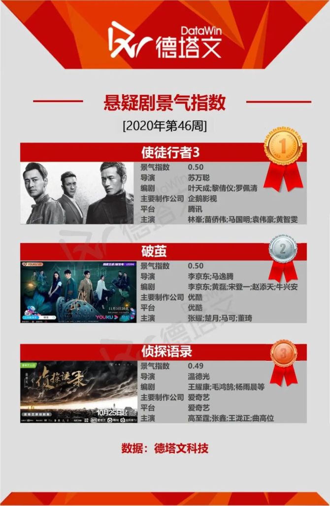 第1位「使徒行者3」は好評の内に会員向けの配信が終了。本週の「破繭」の繁栄指数も先週より高く、「使徒行者3」を引き継ぎ現市場で最高のサスペンスドラマとなった。iQiyiが放送する「偵探語録」は、中華民国の初期を舞台に連続殺人犯を解決するサスペンスドラマ。監督は「瓔珞<エイラク>〜紫禁城に燃ゆる逆襲の王妃〜」などで知られる温徳光(ウン・ダーグァン)。10月25日から放送を開始し、間もなく終了を迎えることもあり、注目度も上昇。