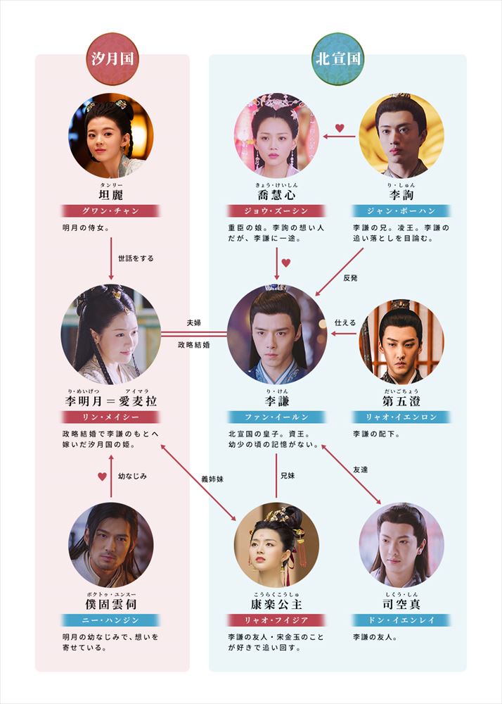 北宣国第一皇子、 凌(りょう)王。 異母弟の李謙とは対立関係にあり、 彼の体面を汚そうと一服盛ったり、 刺客を放って李明月の命を狙うなど、 容赦のない手段を用いることも。 喬慧心(きょう・けいしん)を一途に想い続けており、 その愛の深さゆえ、 彼女の望みをかなえるべく悪事に手を染めてしまう。 そうしたことが度重なり、 良心の呵責に苦しむはめに。