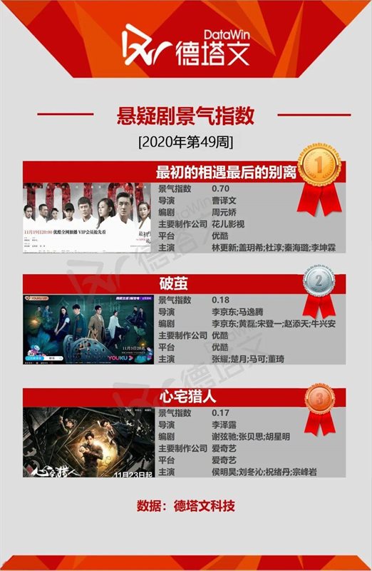 1位はケニー・リン主演の「最初的相遇,最后的別離」が獲得。先週人気のピークに達した「破蚕」は、ネット会員向け放送が終了を迎えピークダウンに。劇中の事例が斬新な場所であり、最近の犯罪捜査ドラマでは比較的優れていると高評価を得ている。「心宅猎人」は民国時代を舞台に繰り広げられるスリル満点のサスペンスアドベンチャー。劇の宣伝投資は少なく、主題も比較的ニッチだが、この主題が好きな視聴者にとっては評判の良い作品に。