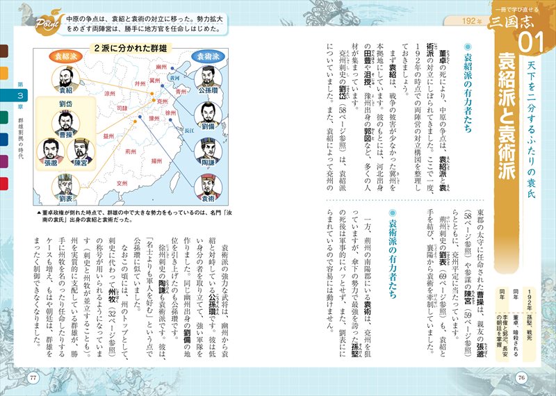 出来事がゴチャゴチャにならないよう、 歴史書としての『三国志』(正史)にもとづいて、 年代順に構成してあります。 また、 「ある出来事と次の出来事がどうつながるのか」を厚く解説しているので、 順番に読んでいくだけで流れが頭に入ります。