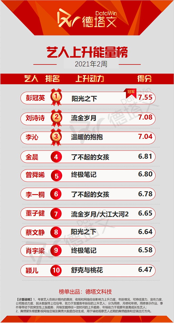中国で市場分析を展開する德塔文科技による影視観察(datawinfilmtv)データより、2021年第2周目(2021.01.01-2021.01.07)の影響力TOP10にランキングした俳優・アーティストを、ピックアップしてご紹介!