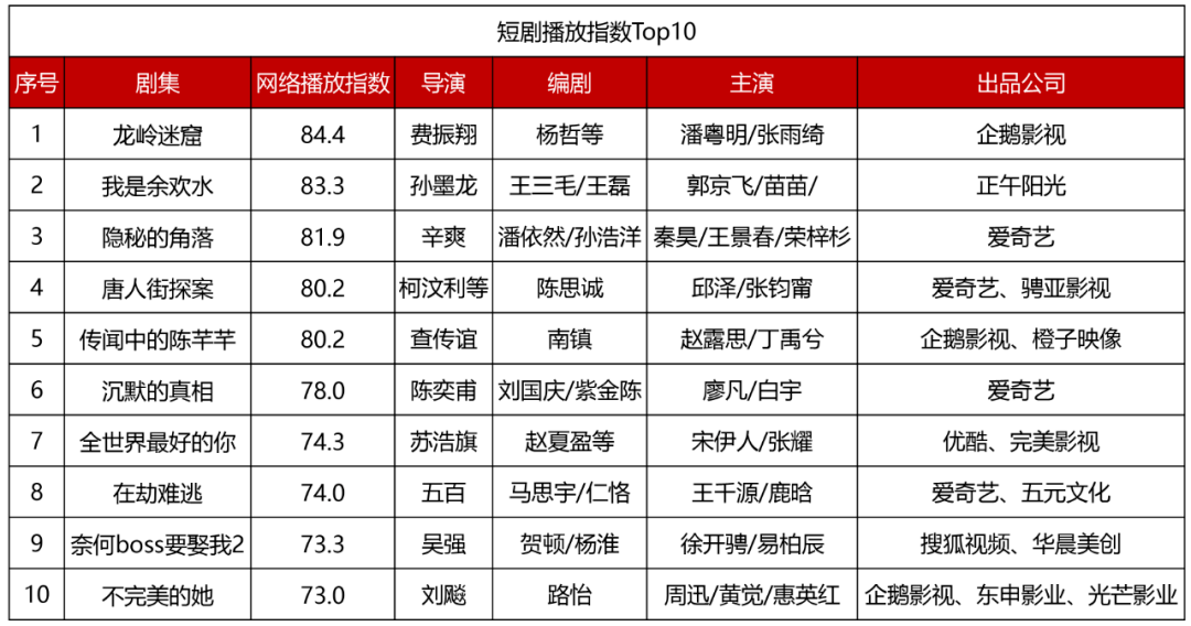 ブリンケージ(Vlinkage)のネット人気ランキングでは、短編ドラマの配信数上位10作品のうち、約半数がネット配信指数80以上で、残りの半数もすべて平均して70以上となっている。ランキング上位3作品は、「龍岭迷窟」、「我是余歓水」、「隠秘的角落」となった。