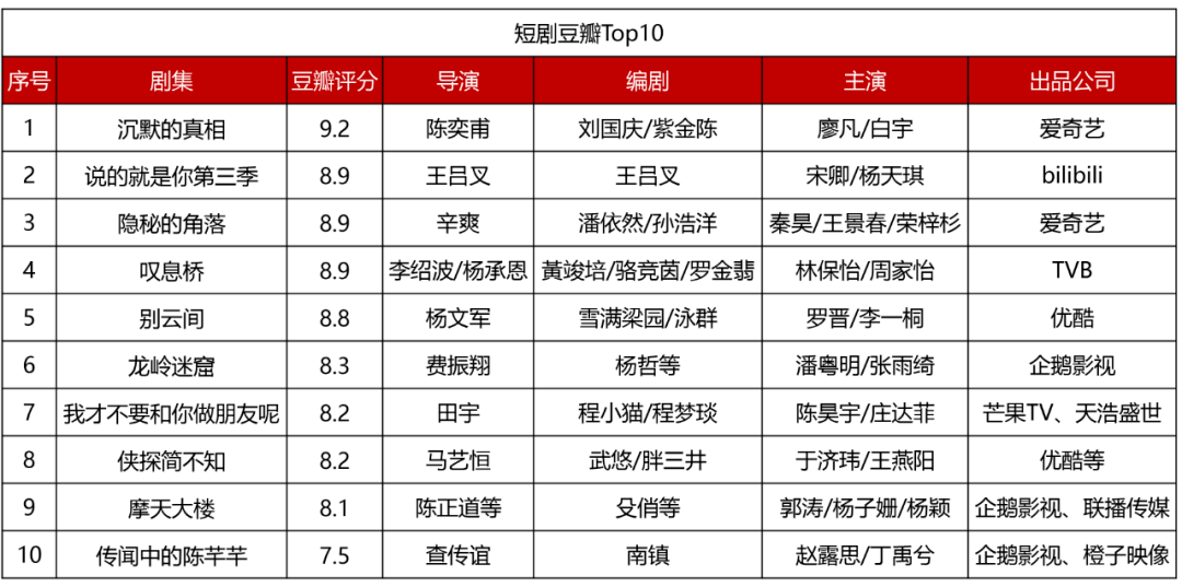 一方、Douban(豆瓣)によると、口コミランキング10のうち、9作品が8点以上の高評価を得ている。1位は「沈黙的真相(原題)」の9.2点。2位は「説的就是你第三季(原題)」、「隠秘的角落」、「嘆息橋」の3作品で、いずれも8.9点を獲得している。7.5点の「伝聞中的陳芊芊(原題)」を除き、いずれも平均8点以上の高得点を獲得した。
