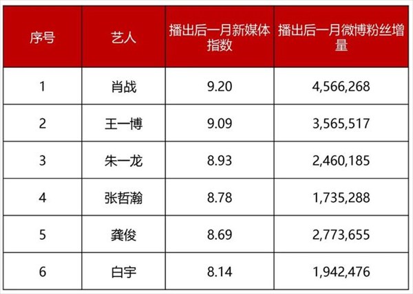 また、Weiboのフォロワー数及びファン数の増加は、アーティストがファンを引き付ける能力を最も直感的に示す指標となっている。番組が放送されてから1か月後、6人の俳優のファンをつかむ能力がすべて指数関数的に増加し、100万を超えた。ランキングはシャオ・ジャン457万、ワン・イーボー 357万、ゴン・ジュン 277万、チュー・イーロン 246万、バイ・ユー 194万、チャン・ジャーハン174万となった。