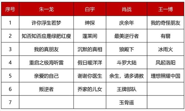 チャン・ジャーハン(張哲瀚)、ゴン・ジュン(龔俊)はドラマが終わったばかりなので、新しい映画とテレビ出演作はまだリリースされていないが、他の4人のダブル主演を飾った俳優たちの映画とテレビの出演作は、量的には4人の俳優の作品がほぼ均等で、シャオ・ジャン(肖戦)は7作品、チュー・イーロン(朱一龍)とバイ・ユー(白宇)は6作品、ワン・イーボー(王一博)は5作品となっている。