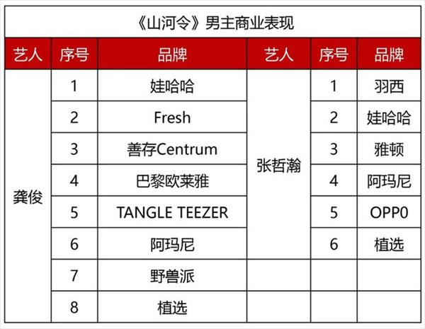 「山河令(原題)」が放送された後、ゴン・ジュンは7つの企業契約を獲得し、チャン・ジャーハンは5つを獲得。
