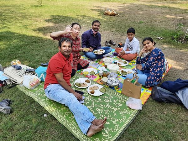 そのため暖かくなってくると日本と同じようにお弁当を持ち寄ってピクニックを楽しむインドの方がたくさんいます。こちらは友人からご提供いただいたお写真。持ってきたお弁当をプレートに分けてみんなでピクニックを楽しんでいます。