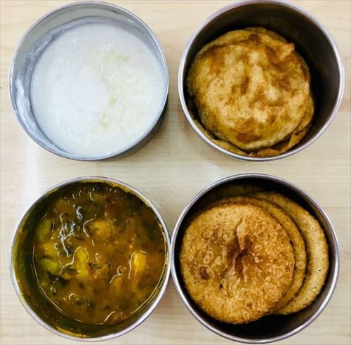 こちらはインドに駐在されている日本人の方にご提供いただいたお写真。インド人の同僚の奥さんが作ってくださったお弁当だそうです。こちらはチャパティを揚げた「プーリー」が入っていますね。