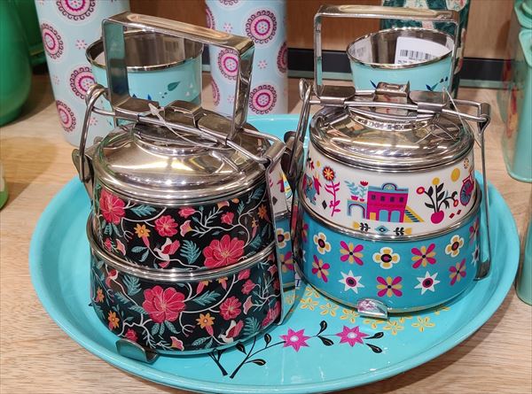 しかし最近インドでもレトロ―ブームなのか、昔懐かしいものをおしゃれにアレンジして売り出しているものも多く、カワイイ3段ステンレスのお弁当箱も売っていました!