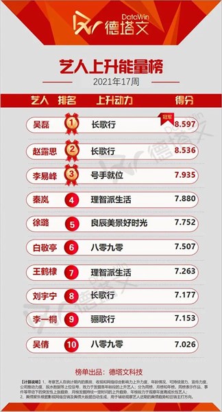 中国で市場分析を展開する德塔文科技による影視観察(datawinfilmtv)データより、2021年第17周目(2021.4.16-22)商業価値※上昇ランキングTOP10にランクインした俳優・アーティストを、ピックアップしてご紹介!